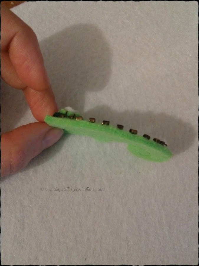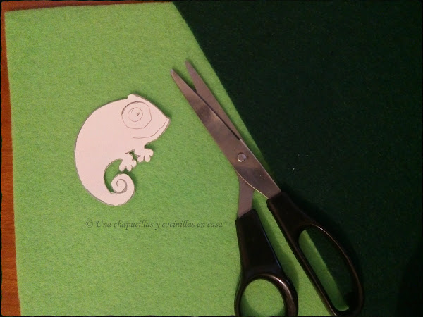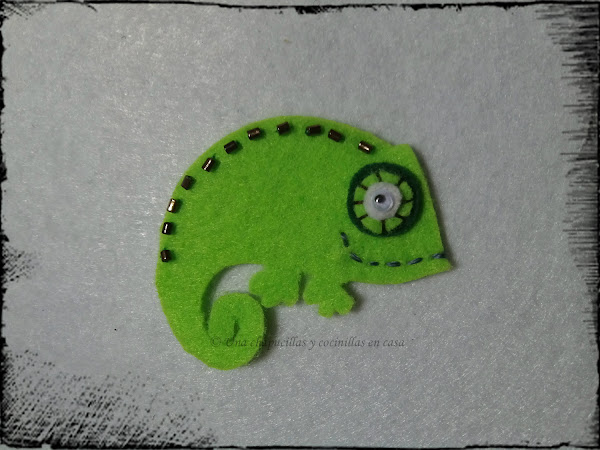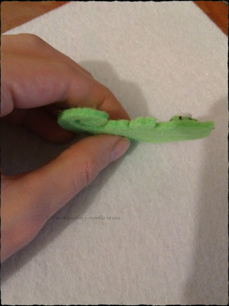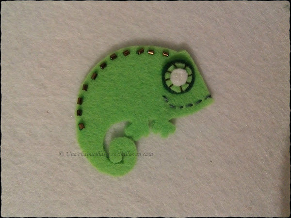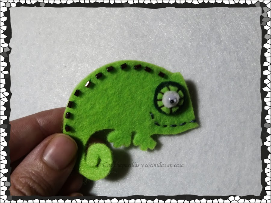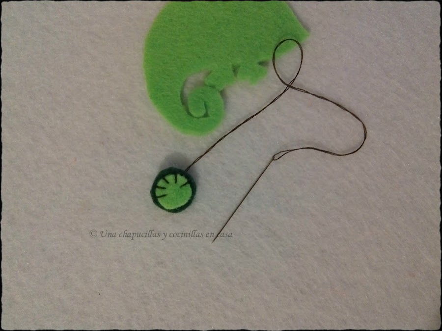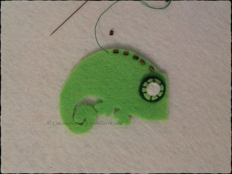 Coserlo ahora al camaleón con el hilo verde oscuro con cuidado de no traspasar al otro lado, como es un fieltro grueso es relativamente fácil.