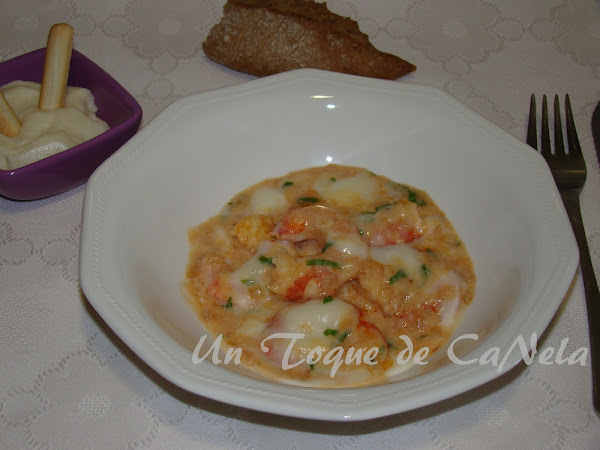 Y en casa, la hemos bailado con este delicoso plato de "Camarao com Catupiry", un queso que no se encuentra en España peeero, buscando, buscando la receta, lo he hecho de una receta casera de Sandrynne Guimaraes.