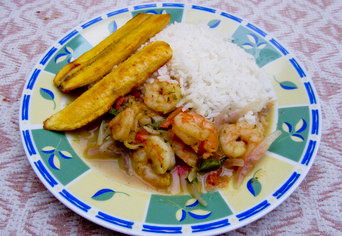 En una cacerola mediana, poner a hervir los camarones hasta que tomen color y luego retirar del fuego, aparte en una sartén honda poner a hervir el agua de coco, cuando esté a punto de ebullición colocamos los la cebolla finamente picada en corte pluma, el tomate picado en cuadritos y retiradas las semillas y el pimiento finamente picado en tiritas.