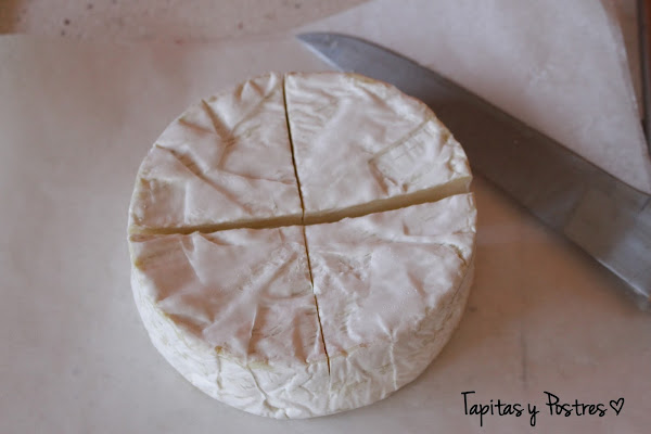 Vamos a cortar el queso en cuatro partes sin llegar hasta el final. Lo ponemos en un papel de horno y horneamos a 180º hasta que veamos que se ha fundido. Alrededor de unos 15 o 20 minutos.