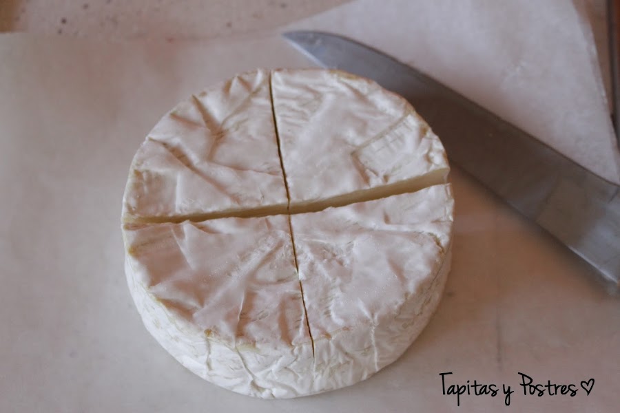 Cortamos el queso en cuatro porciones, sin llegar hasta abajo. Lo horneamos sobre un papel vegetal hasta que se funda.