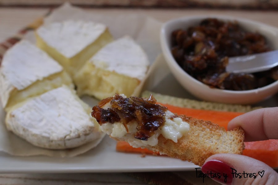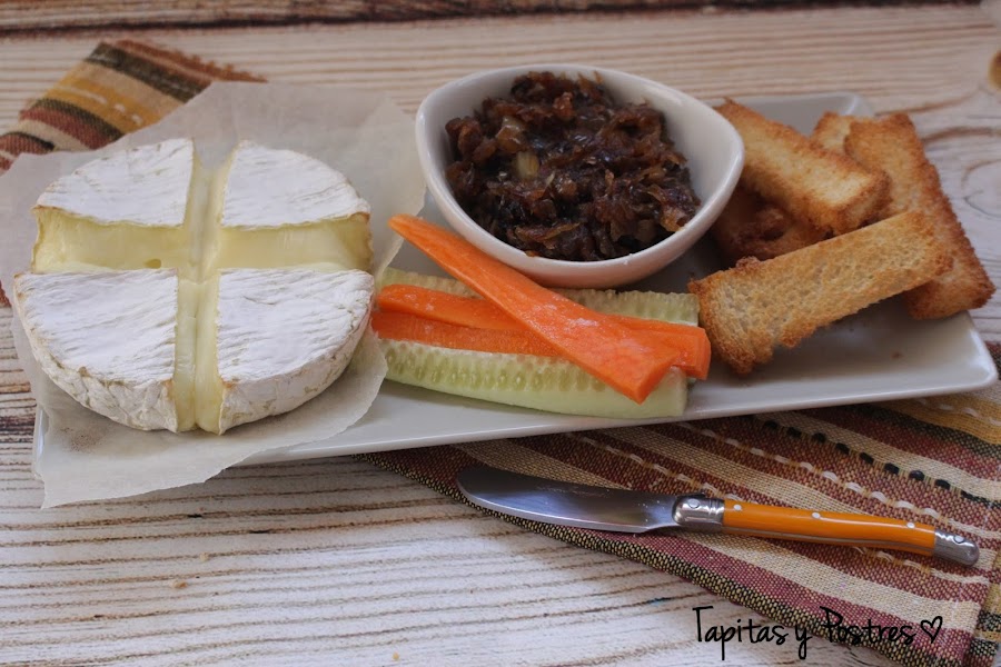 una vez que el queso se haya fundido, preparamos una bandeja con los bastoncitos de verdura, los palitos de pan tostado y un cuenco con cebolla caramelizada. Servimos caliente.