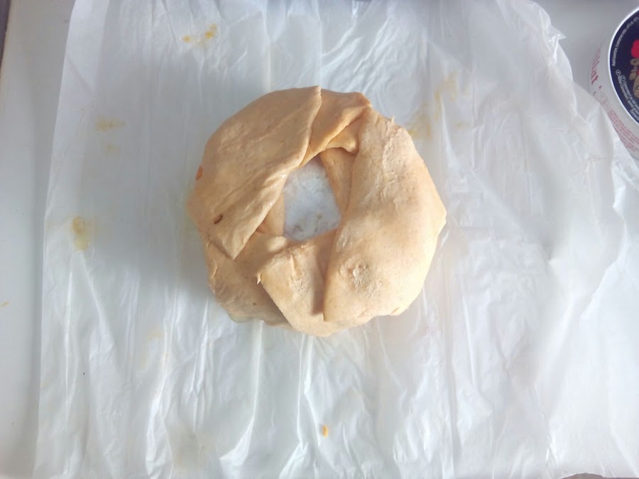 Partes la masa en ocho partes y vas envolviendo el queso. Una vez envuelto juntas la masa y la vuelves a pintar con yema de huevo. Lo metes al horno durante 20 minutos a 190º y ya está listo para comer.