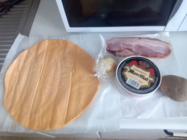 Cocemos la patata, mientras sofreímos la cebolla y el beicon. Se unta en la masa la yema del huevo y se pone el camembert partido por la mitad en mitad de la masa.