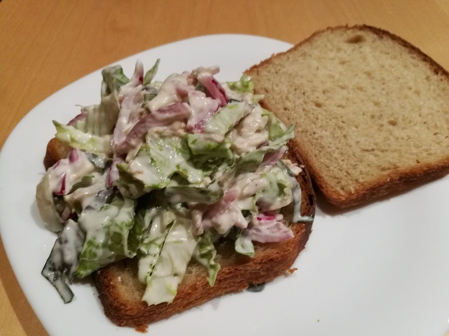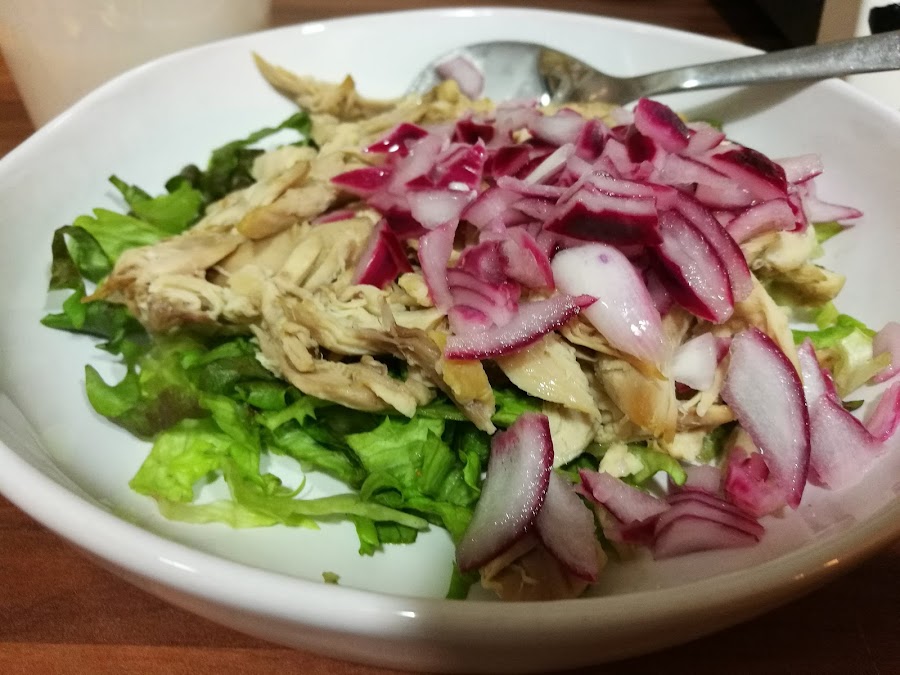 - Mezclar el pollo troceado, la mayonesa, la lechuga con un poquito de sal y la cebolla