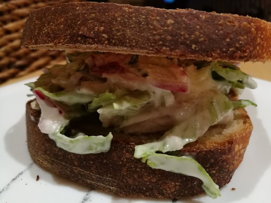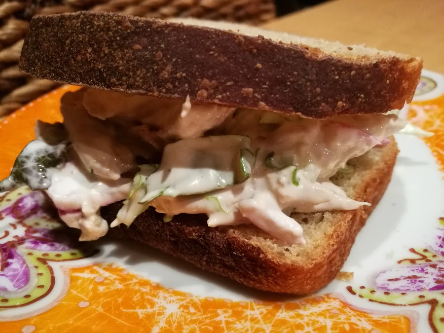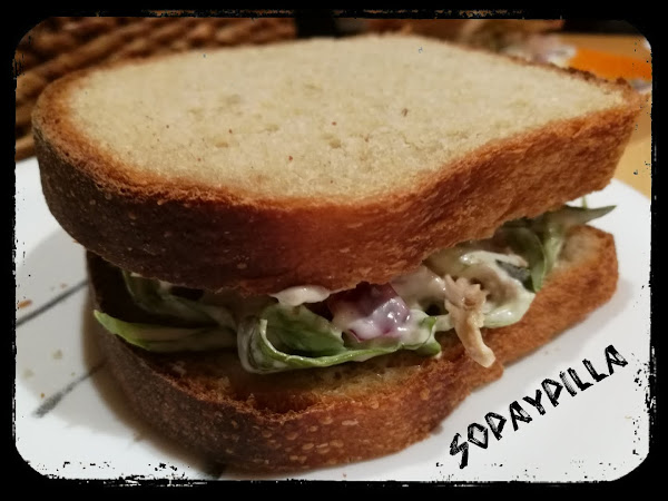 Hoy os traigo un bocata ideal para una cena informal, de esas que no tienen faena, y además de aprovechamiento. Yo lo hice con la carne del pollo de haber hecho el caldo, pero si queréis se puede hacer pasando dos filetes de pollo a la plancha. estará igual de bueno, y si la mayonesa es casera, ya es una delicia!!