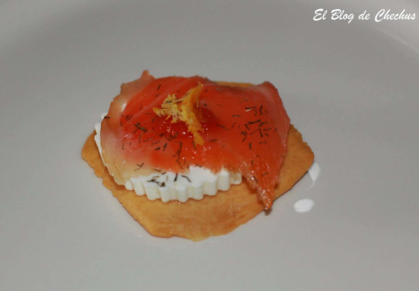 Solo tenemos que poner nuestra galleta o tosta de pan, encima una laminita de salmón ahumado, y luego solo tenemos que poner un poquito de tomate, la ralladura del limón, y aderezar con pimienta y eneldo. Ya lo tenemos!!