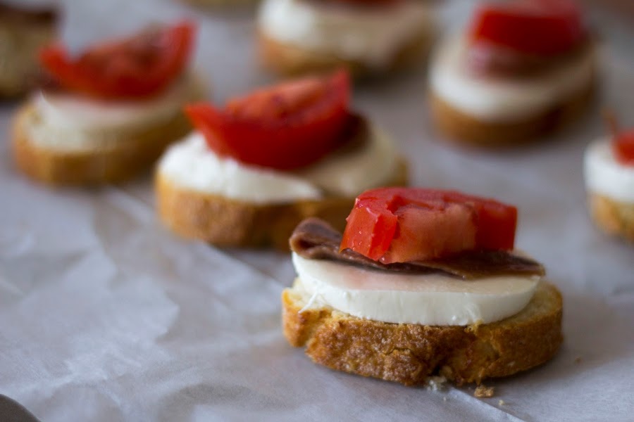 1. Colocamos las rebanadas de pan sobre la bandeja del horno y colocamos sobre cada rebanada de pan una rodaja de mozzarella, encima un filete de anchoa. y despúes una rodaja de tomate.