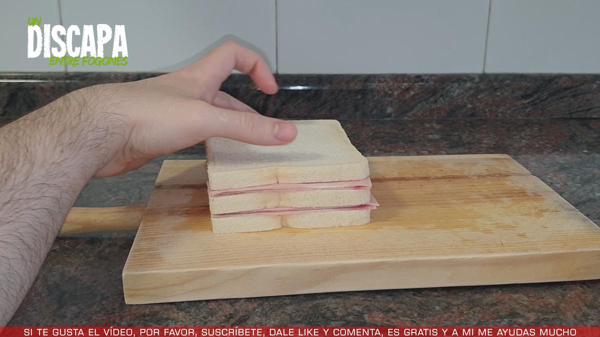 2Ahora colocamos una loncha de jamón sobre la rebanada de pan de molde, después colocamos una loncha de queso, podéis usar el queso que más os guste. Y ahora ponemos otra loncha de jamón. Ahora ponemos otra rebanada de pan de molde y volvemos a repetir la operación… ponemos una loncha de jamón, una loncha de queso y por último otra loncha de jamón. Ahora colocamos la última capa de pan de molde.