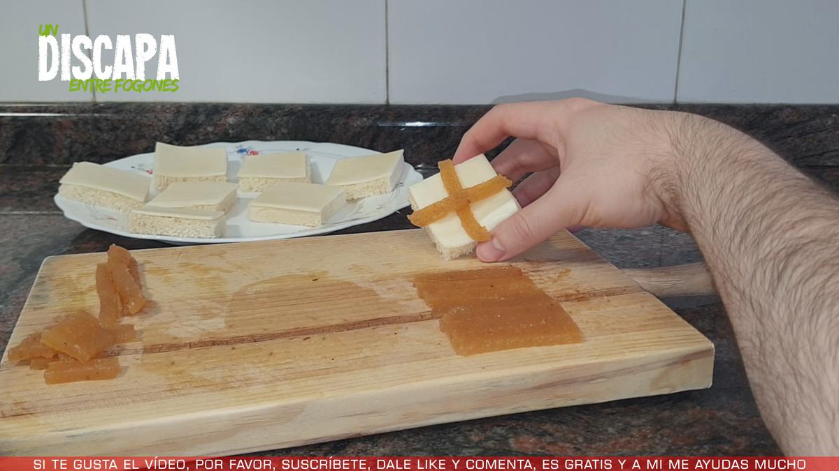 3Ahora vamos a cortar unas tiras finas de membrillo. Y las colocamos encima del queso formando una cruz. Y ya tendríamos listo otro canapé facilísimo de hacer.