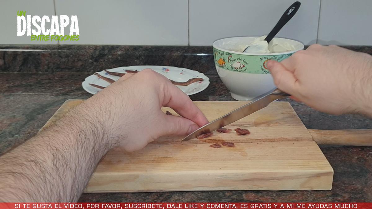 2Aquí tengo unas anchoas en conserva que vamos a trocear muy finamente. Y una vez picadas todas las anchoas las añadimos al bol y lo mezclamos bien para que se integren todos los ingredientes.