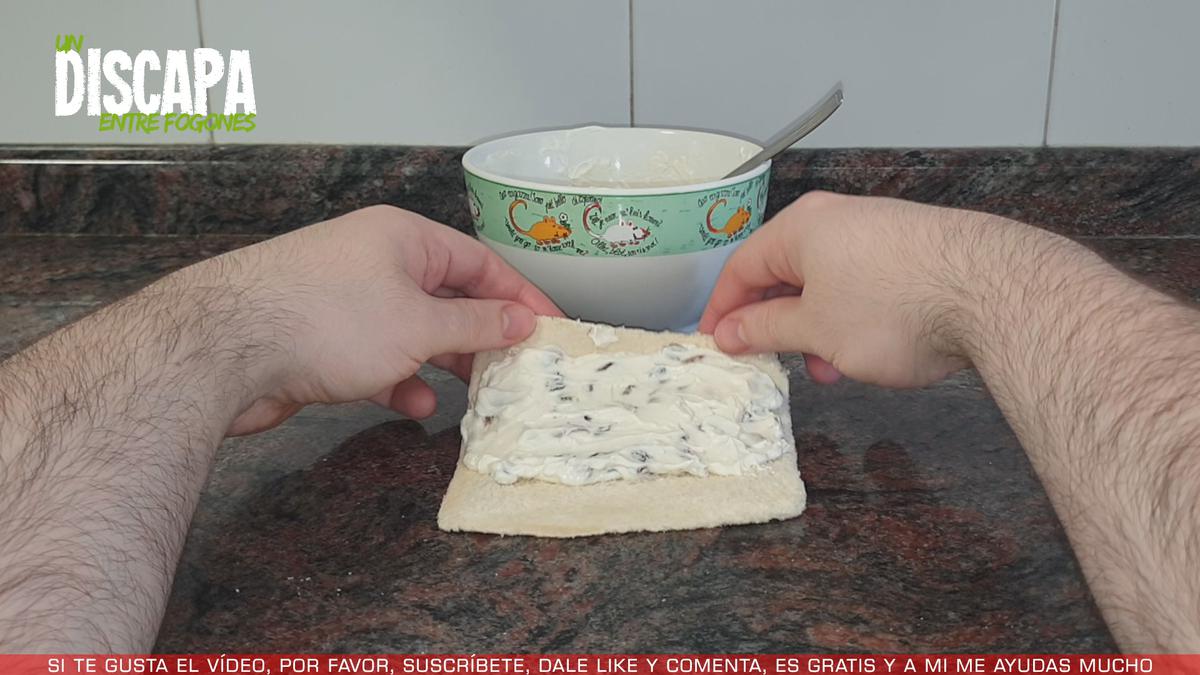 4Y a continuación vamos añadiendo el relleno sobre el pan. Dejaremos por la parte de arriba un espacio libre de aproximadamente un dedo. Y dejaremos un espacio de unos 2 dedos por la parte de abajo para que así no se nos salga el relleno. Y empezamos a formar el rollito. Vamos enrollándolo poco a poco y sin hacer demasiada fuerza para que no se salga el relleno.