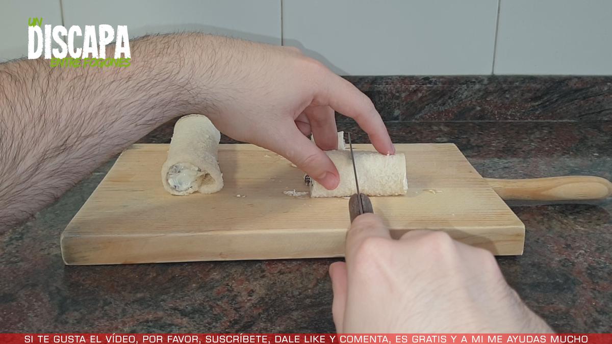 5Ahora cortamos los extremos del rollito, que es la parte más fea, y después cortamos trozos de 1cm o 1.5cm. Y ya estaría listo este delicioso canapé.