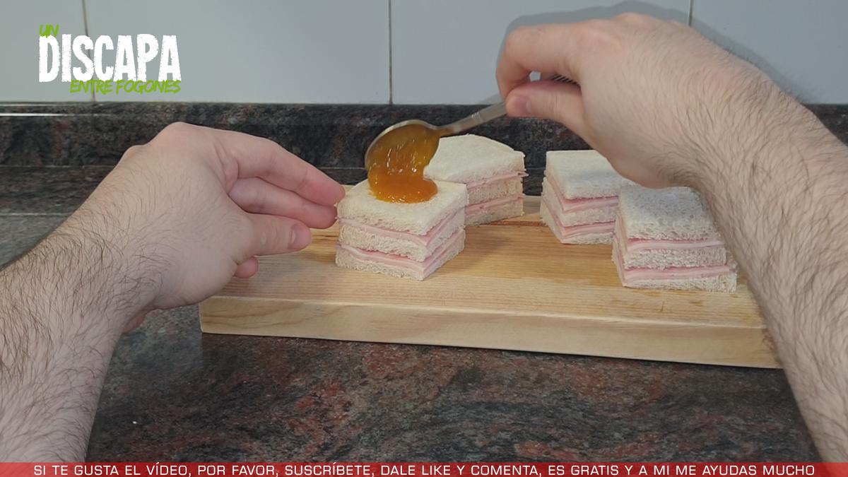 4Y por último, untamos por encima un poco de mermelada de mango. Y ya tendríamos listo nuestro primer canapé.