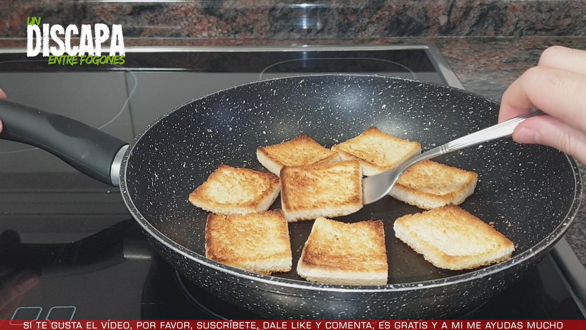 1Aquí tengo unas rebanadas de pan de molde que vamos a cortar en 4 partes iguales. Y una vez cortadas, las llevamos a la sartén a que se tuesten un poco a fuego medio. Cuando ya se han dorado por una cara le damos la vuelta para que se doren por las dos caras. Y cuando ya están doradas por las dos caras las reservamos en un plato.