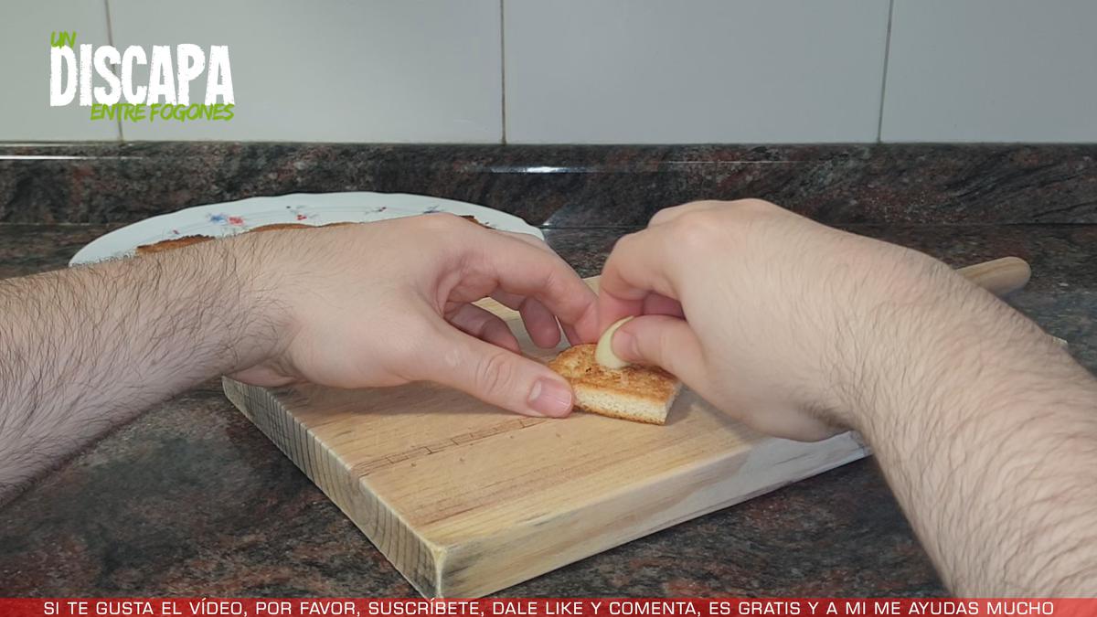2Ahora partimos un diente de ajo por la mitad y lo frotamos sobre el pan tostado.