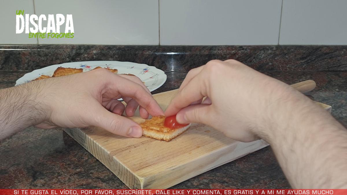 3Ahora cogemos unos tomates cherry, los partimos por la mitad y los frotamos también sobre el pan tostado.