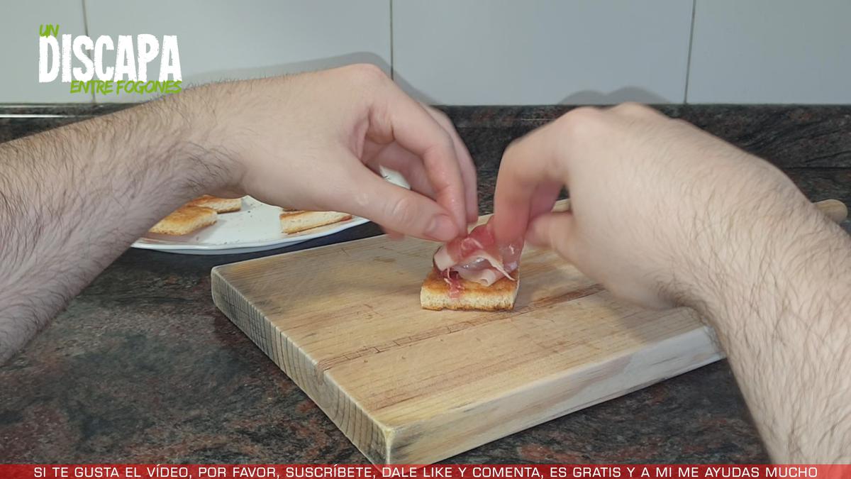 4Ahora cogemos una loncha de jamón serrano, la partimos por la mitad a lo largo y cada una de las mitades las vamos colocando sobre los panes tostados.