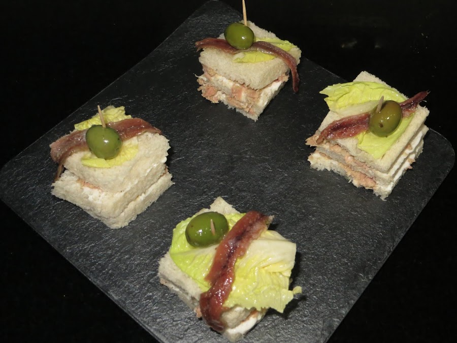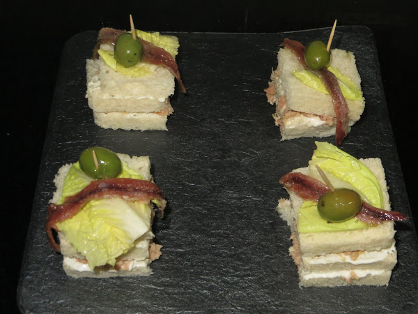 A continuación, cortamos en cuatro porciones y colocamos encima la lechuga, una anchoa y una aceituna y ya están listos para servir.