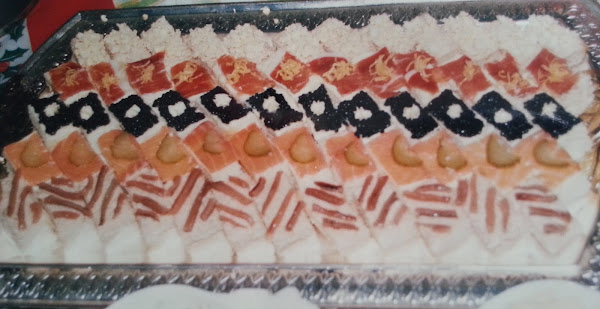 1. - Canapé de huevas de lumpo: Untamos dos rebanadas de pan con mantequilla y ponemos una sobre la otra, con la mantequilla hacia arriba. Sobre la mantequilla extendemos las huevas y cortamos la rebanada por la mitad, formando dos rectángulos, y cada rectángulo en 4 partes, primero por la mitad, y cada mitad en 2. Y decoramos por encima con un toque de mantequilla o mayonesa.