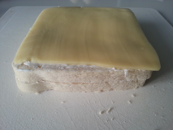 3. - Canapé de York: La misma operación que con las huevas , es decir, con mantequilla, y colocamos una loncha de jamón y cortamos. Para decorar, yo he utilizado trocitos de roquefort, podéis poner lo que queráis.
