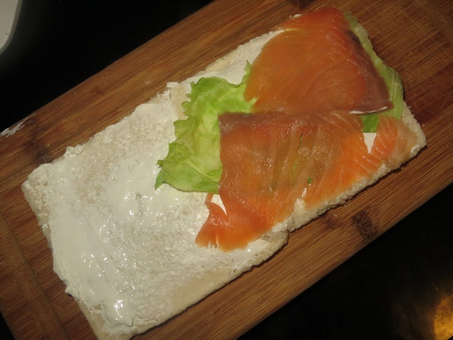 Cogéis dos rebanadas de pan de molde o una, dependiendo de lo gordo que queráis que sean vuestros canapés, yo hice de los dos tipos. Cogí dos rebanadas de pan de molde sin corteza, los aplané y los uní con un rodillo, unté la crema de queso al pacharán y luego coloqué encima una hoja de lechuga, sin que cubra las dos rebanadas de pan, si no 2/3 ya que si no se saldría y encima el salmón ahumado. Enrollamos y lo colocamos bien apretado como si fuera un caramelo en papel film. Lo metemos a la nevera hasta el momento de consumir.