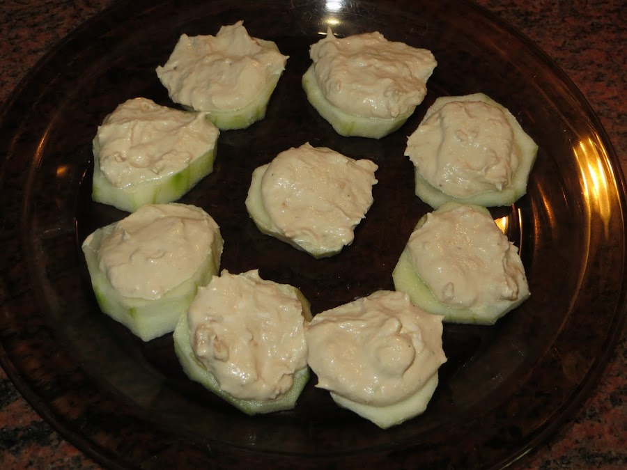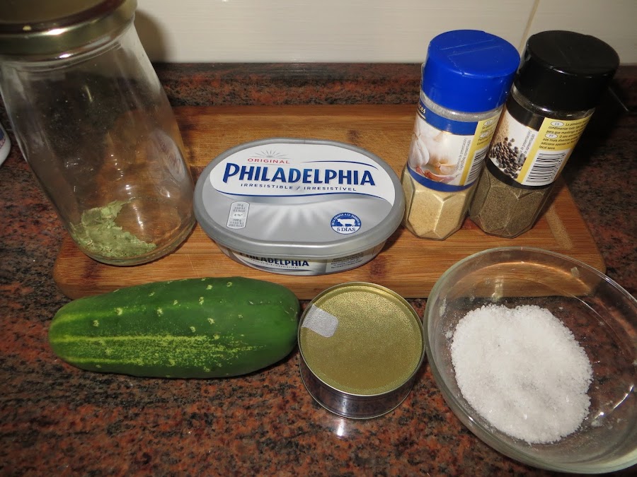Lo primero que hacemos es pelar y cortar el pepino en rodajas de medio centímetro. Escurrimos la lata de atún y lo echamos en el vaso de la batidora con el queso crema, el zumo de medio limón, un poco de sal y pimienta, media cucharadita de café de orégano y otra media cucharadita de ajo en polvo. Batimos todo y lo colocamos encima de las rodajas de pepino y ya tenemos listos nuestros canapés.