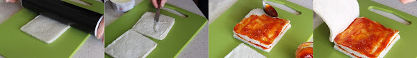 Es muy fácil de hacer, tan solo tenemos que aplastar las rodajas de pan un poco con el rodillo , pero no demasiado, luego untamos tres rodajas con una capa de queso crema, ponemos otra capa encima de mermelada de pimientos.