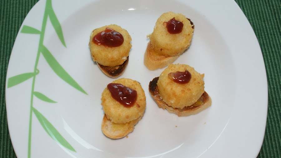 Cortamos el queso en discos del grosor que deseemos, os aconsejo que no sea muy fino, corremos el riesgo de que se rompa. Rebozamos los discos de queso con huevo y pan rallado, freímos el queso a fuego medio para que no se nos desaga.