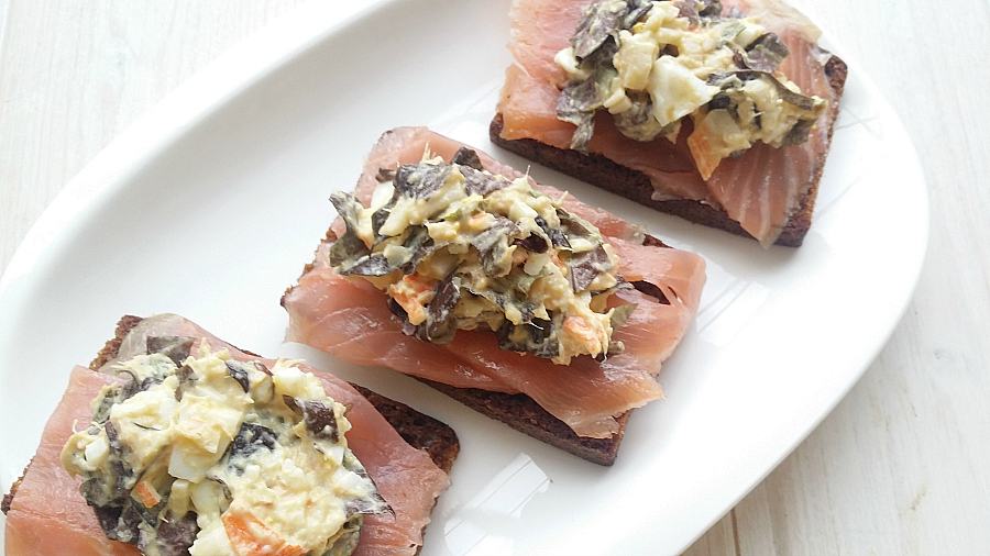 2. Cubrimos cada rebanadita de pan de centeno y miel Gerblé con un trocito de salmón ahumado y encima le colocamos una cucharadita de la mezcla anterior.