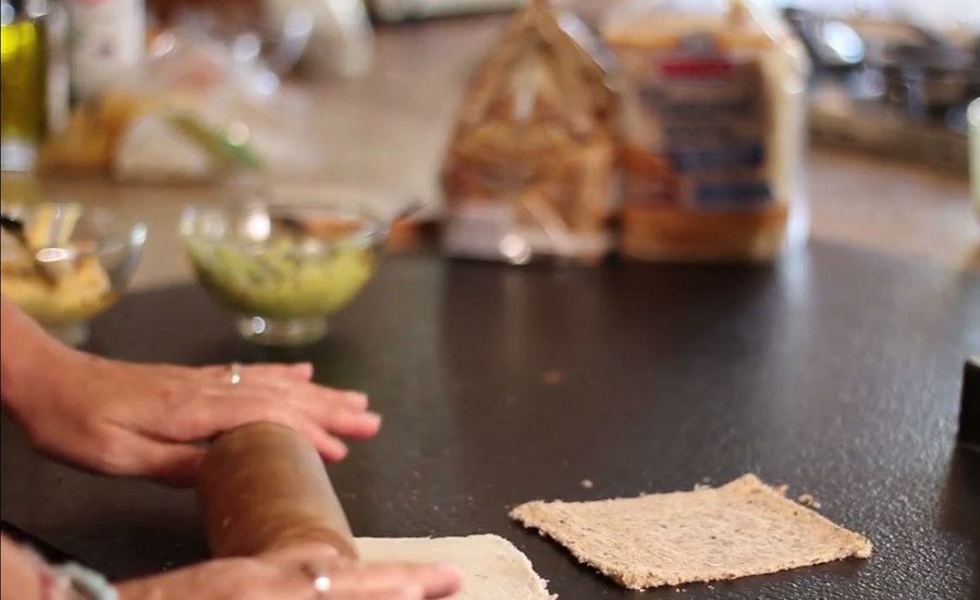 Para hacer los rollitos-canapés, aplastamos y extendemos unas rebanadas de pan de molde, preferiblemente sin corteza, con la ayuda de un rodillo de cocina. Luego, untamos o ponemos sobre ellas los ingredientes que más nos gusten. Nosotros untamos la mitad de las rebanadas de hummus y la otra mitad de guacamole.