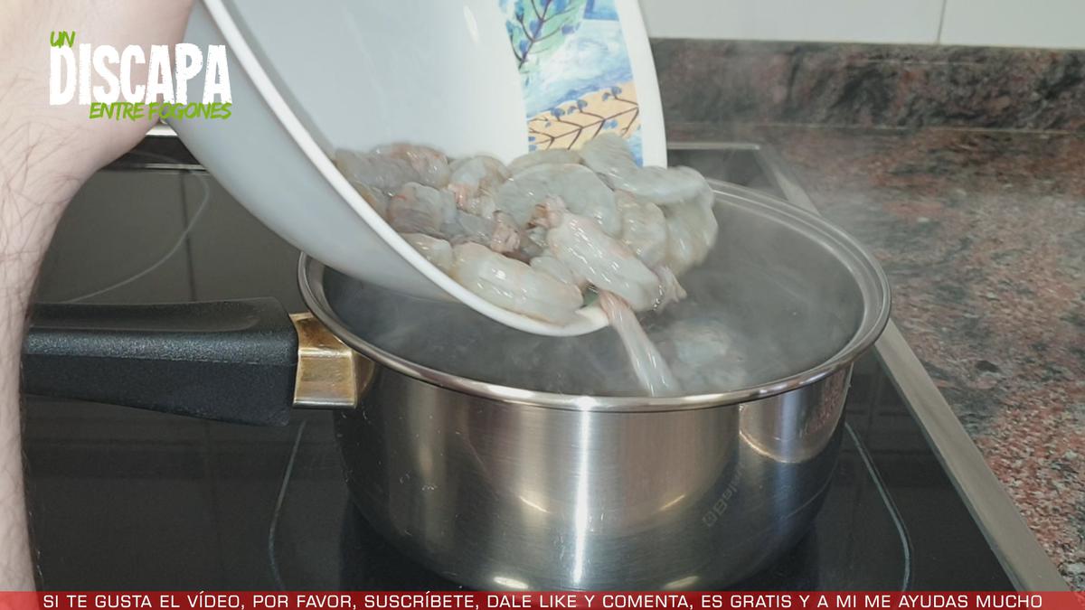 Cuando ya tenemos todos los langostinos pelados y limpios los añadimos a un cazo con agua hirviendo y los dejaremos 1 o 2 minutos.