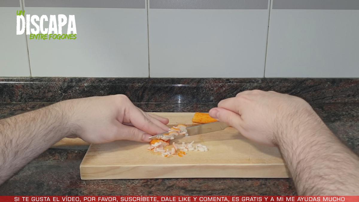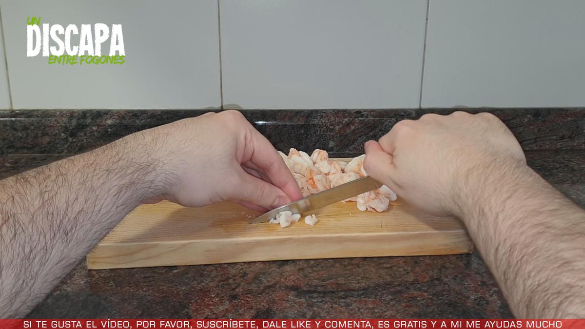 2Mientras se cuecen los langostinos, vamos a picar finamente 2 palitos de surimi.