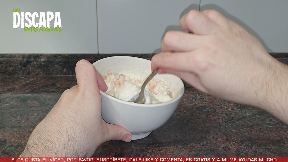 4Ahora en el bol añadimos 2 cucharadas de mayonesa y lo mezclamos todo bien hasta que se integren los ingredientes.