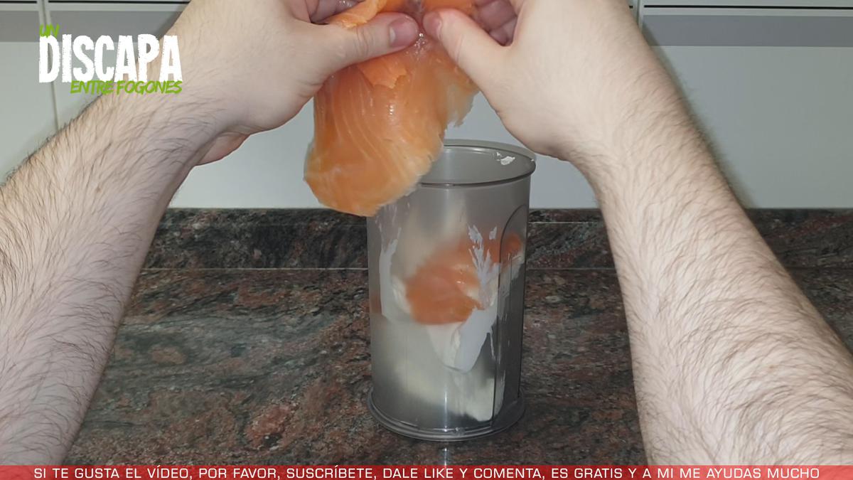 2Después añadimos unos 125 gr de salmón ahumado, yo lo parto en trozos para que luego sea más fácil triturarlo.