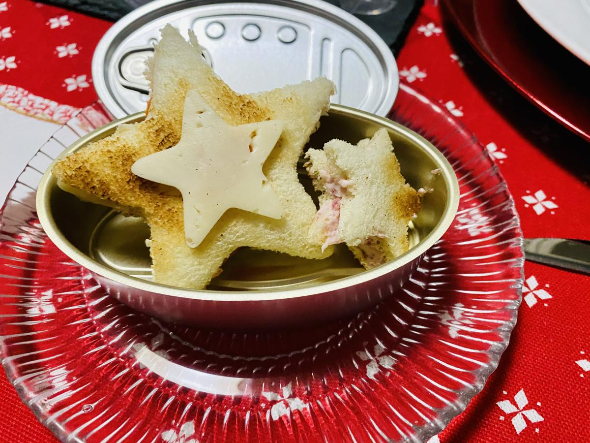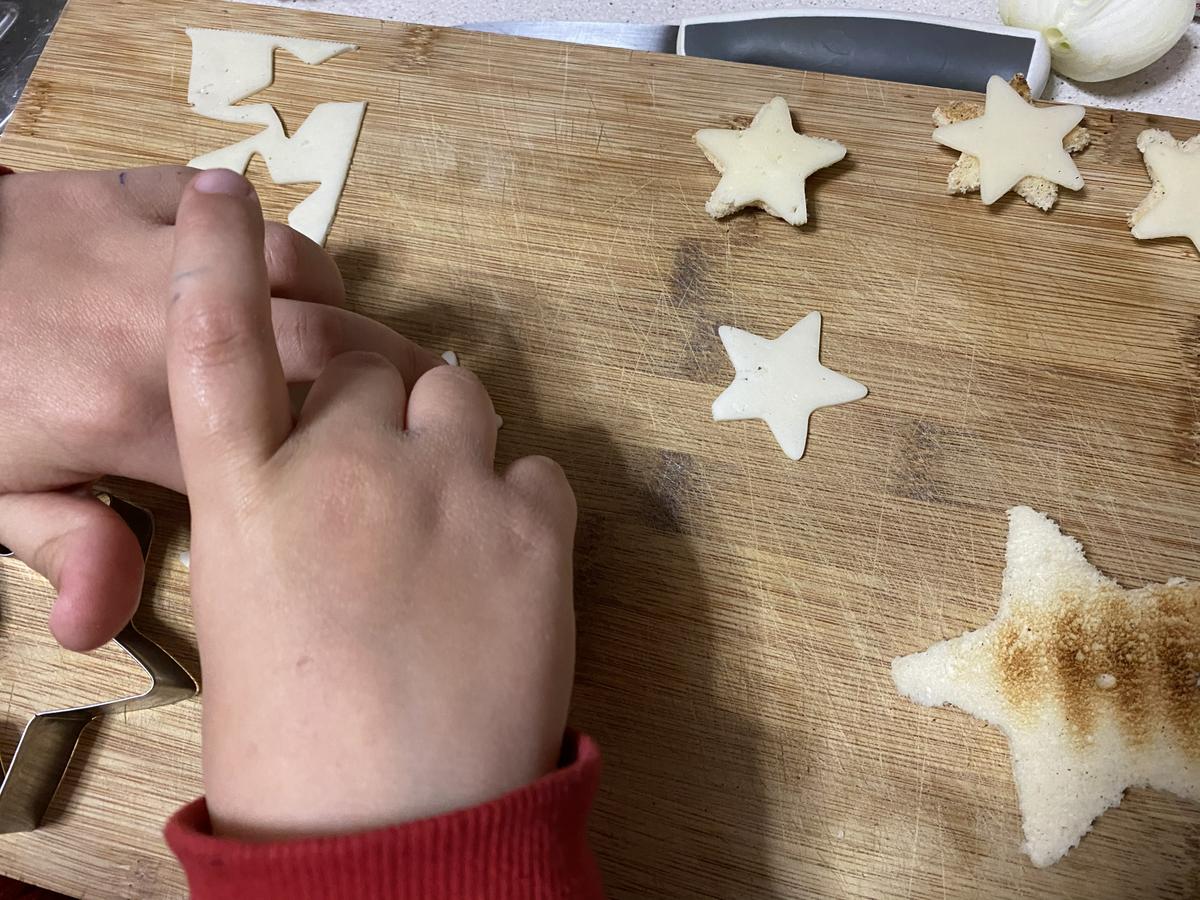Sobrasada con miel y queso. En un cuenco, calienta un par de cucharadas de sobrasada con 1/2 cucharadita de miel durante unos 5 segundos en el microondas. Mueve la mezcla y unta una parte de una de las estrellas de pan. Con el mismo cortapastas que usaste para el pan, corta una loncha de queso tierno y ponla encima de la sobrasada. Cierra con otra estrella de pan (si sale un poco de sobrasada por los bordes aplánalos con un cuchillo de untar). Puedes poner un poquito de sobrasada en la parte exterior de la estrella y pegar una estrella de queso más pequeña, como hicimos nosotros. ¡Quedan muy monas!