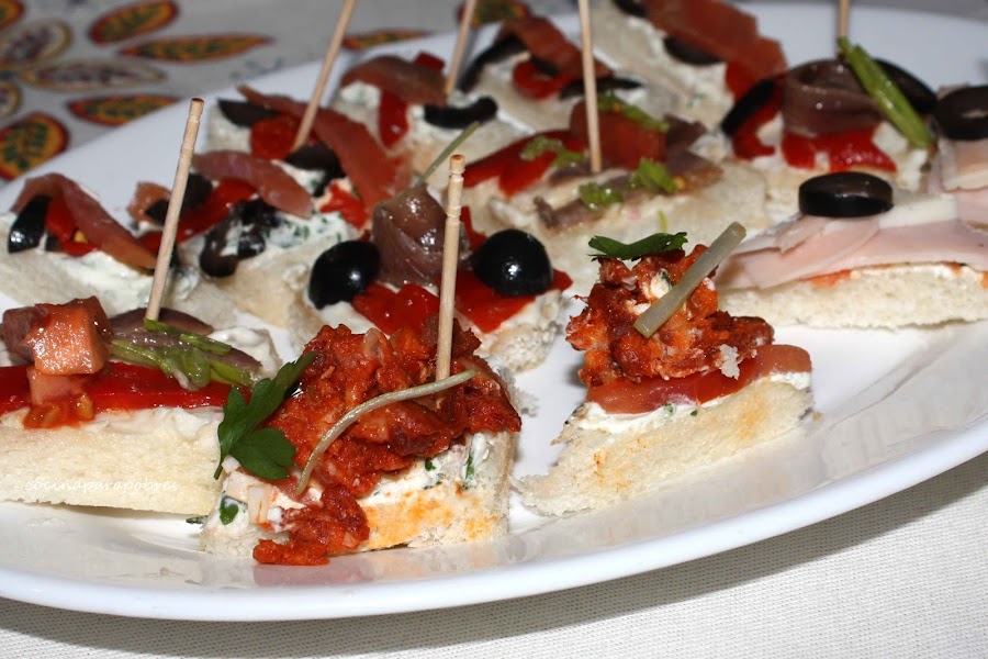 Pimientos de piquillo con aceitunas negras queso, chorizo picante y picada de cebollino.