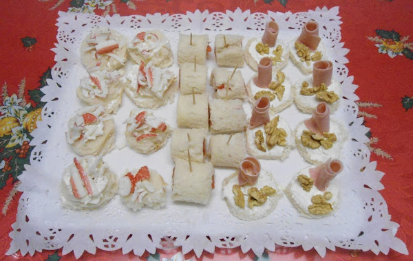 2 canapé - aplastamos una rebanada de pan con un rodillo, untamos queso cremoso y ponemos una lonchita de bacalao ahumado o (salmon),enrollamos el pan y le ponemos un palillo en el centro para sujetarlo.