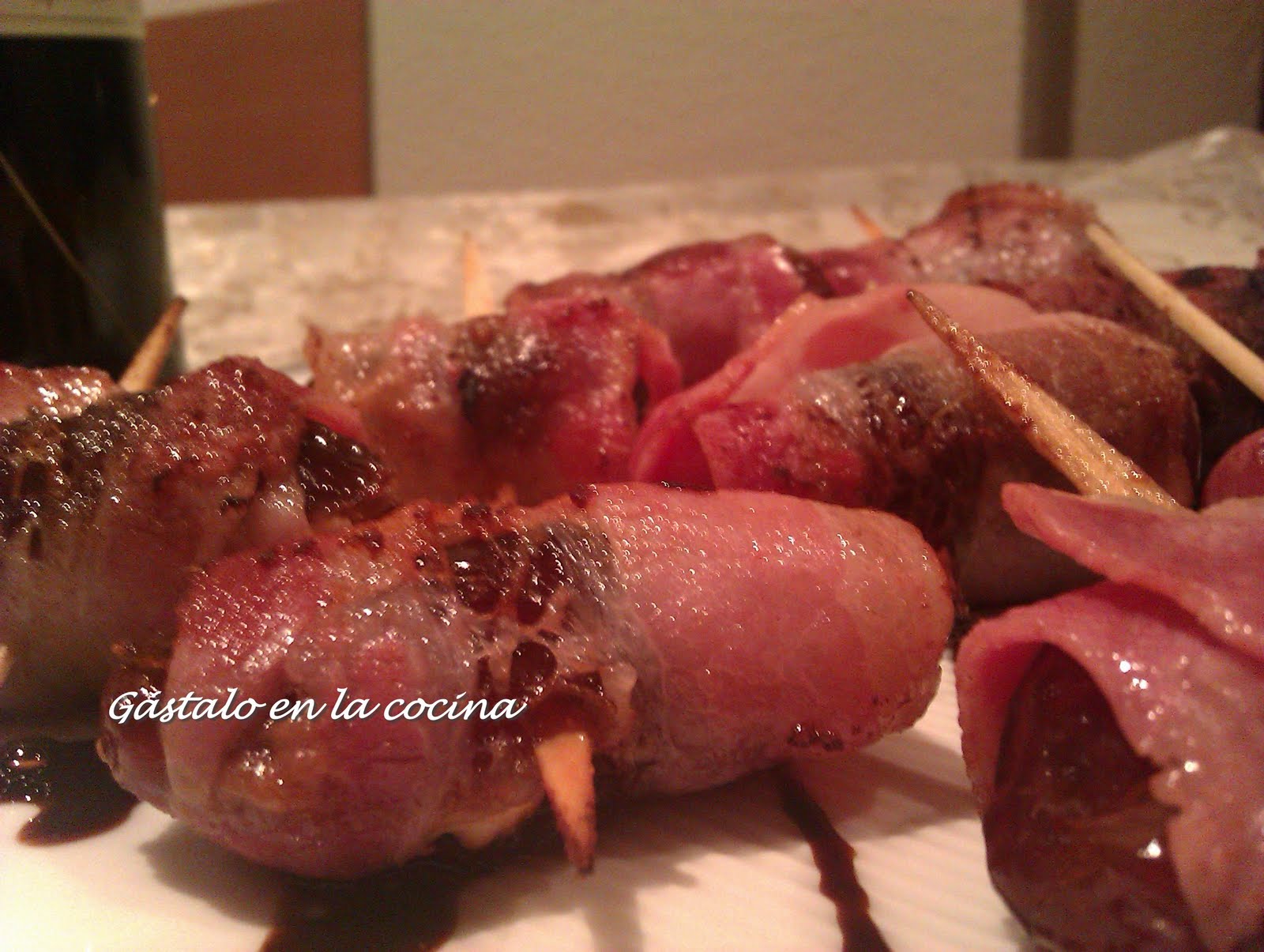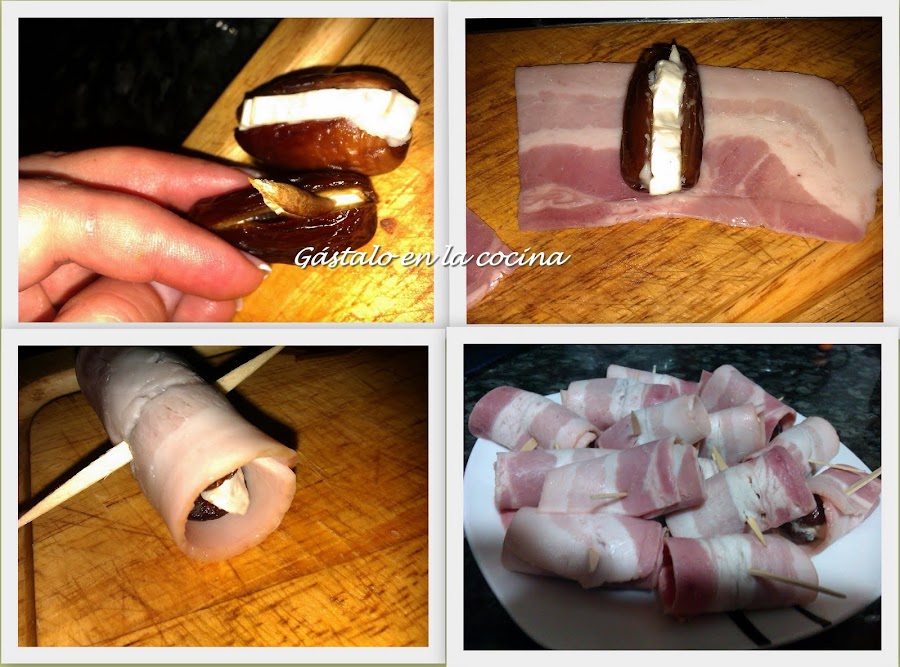 Cortamos cada loncha de bacon en dos y envolvemos los dátiles; lo sujetamos con un palillo.