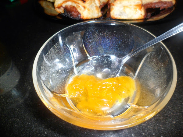 Mientras en un bol pequeño, pondremos 2 cucharadas de mermelada de melocotón y 2 cucharadas de agua lo metéis unos 30 segundos al micro , removemos.