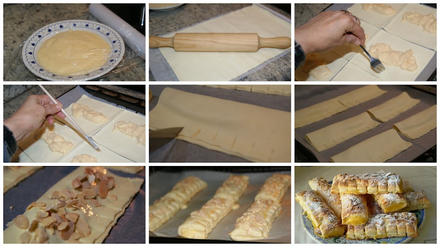 Coloca encima de cada rectángulo unas cucharadas de crema pastelera en el centro y en forma alargada, sin llegar al borde. Yo lo hago con una cuchara, pero se puede usar manga pastelera. Pinta uno de los bordes con la clara que has quitado a los huevos. Dobla por la mitad de manera que se queden pegados los bordes largos y presiona un poco para que queden bien sellados. Haz unos cortes, a modo de flequillo, sin llegar a la zona donde está la crema, y pinta la superficie con clara. Cubre con las almendras laminadas.