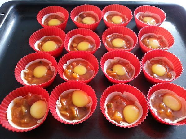 2. - Con una cuchara, repartimos el sofrito en cada molde. Podéis hacer un hueco en el centro del sofrito, para el huevo, esto tampoco es importante.