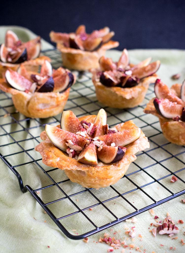 4Cortar cada higo en 6 partes. Repartir cada uno sobre las canastitas ya frías, en forma de flor. Espolvorear con la nuez tostada y terminar chorreando con una cucharada de miel por encima de los higos.