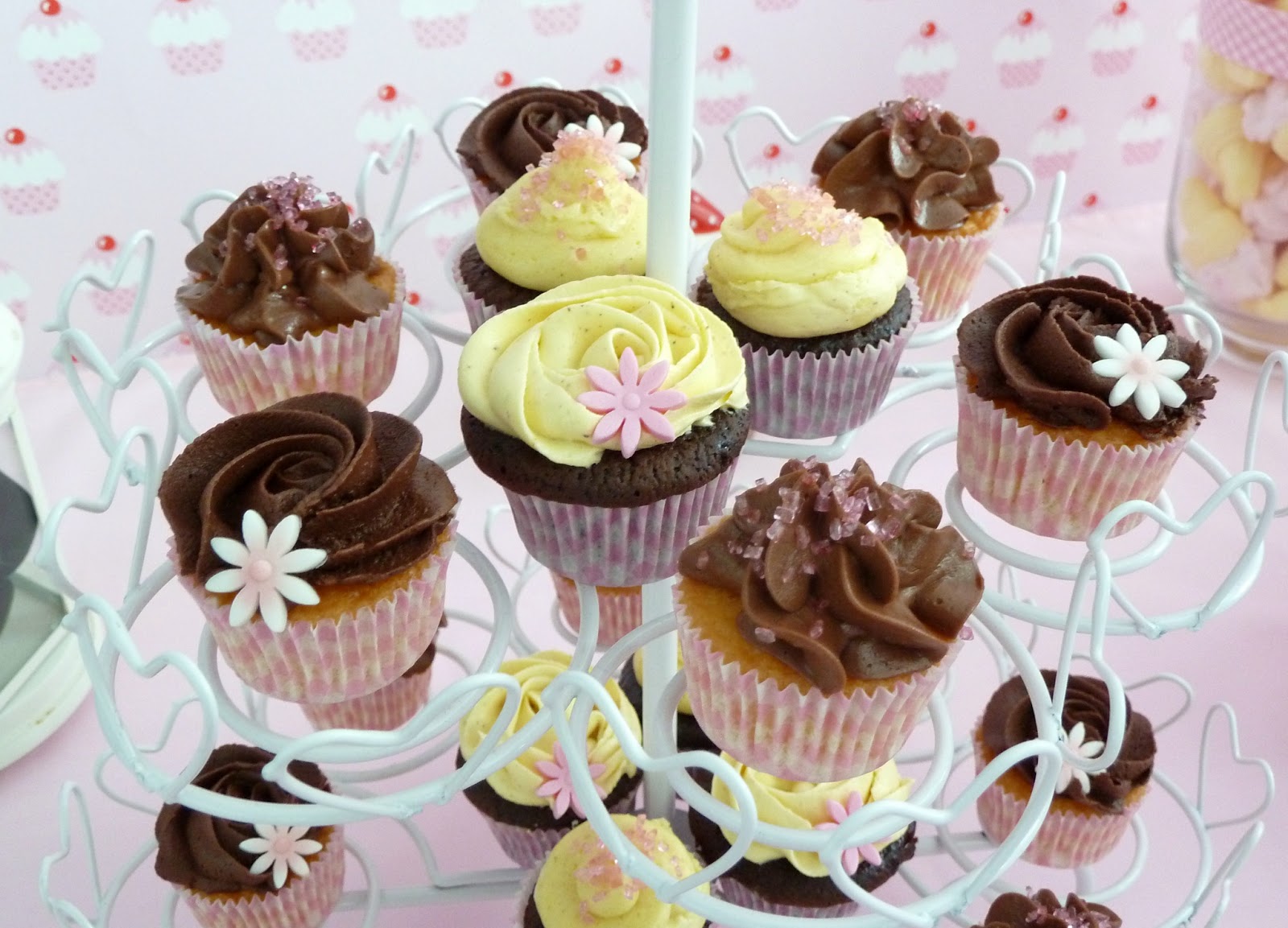 Stand de minicupcakes de chocolate con frosting de mascarpone y buttercream, de vainilla y de chocolate.