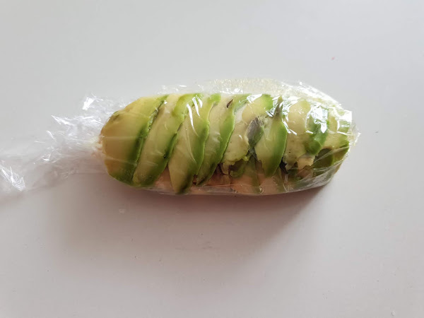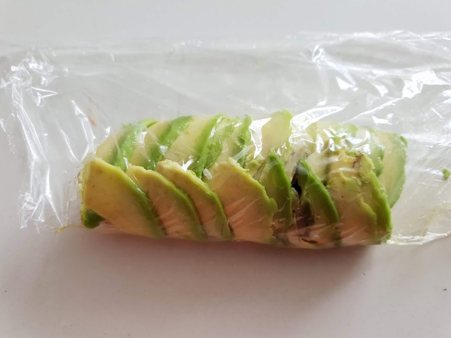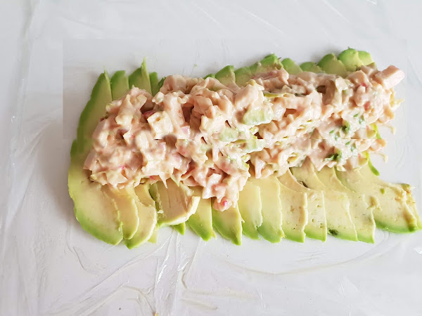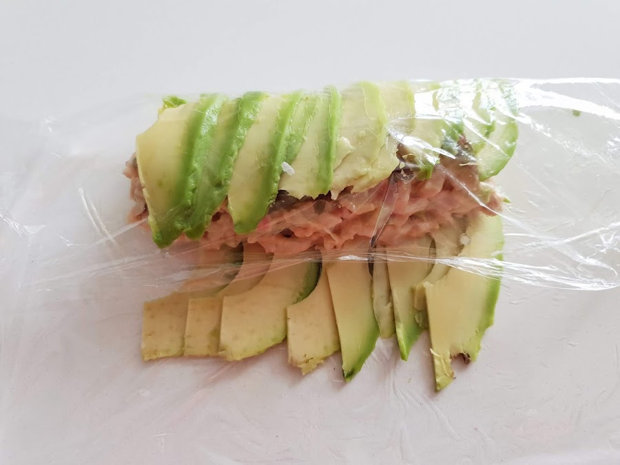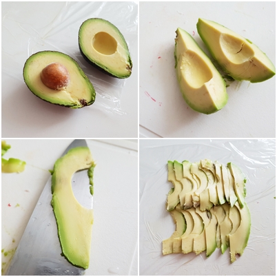 3. - Extendemos un trozo de film sobre la encimera y pasamos al aguacate, que cortaremos por la mitad, pelamos, deshuesamos y lo vamos cortando en finas láminas que iremos colocando en dos filas superpuestas.