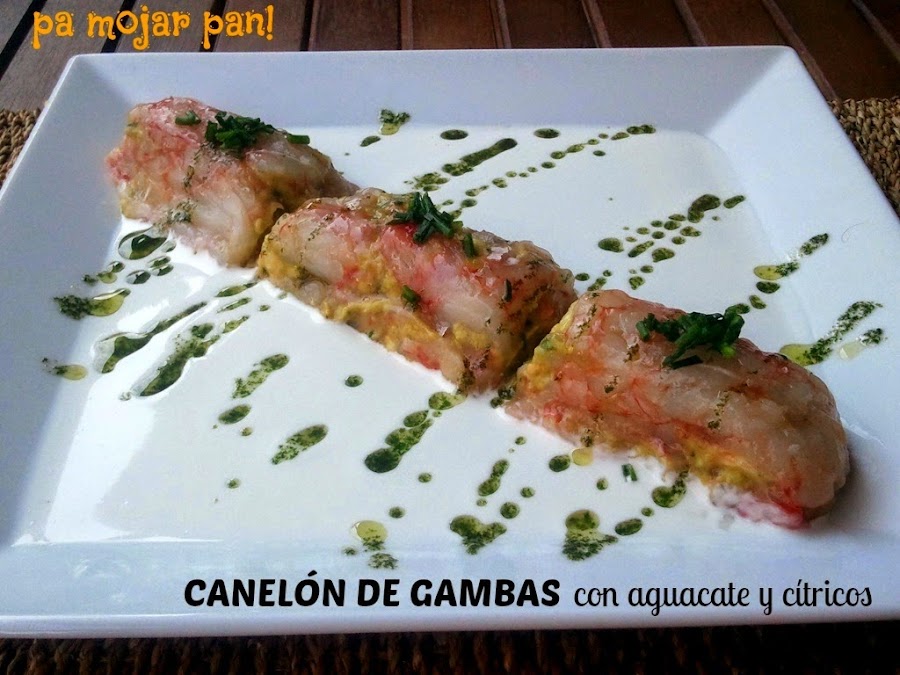 Ahora solo nos queda el emplatado: Disponemos un par de cucharadas de la salsa en el fondo del plato. Ponemos el ?canelón? de gambas encima. Echamos unas gotitas de aceite de cilantro alrededor y un poquito de cebollino picado por encima.