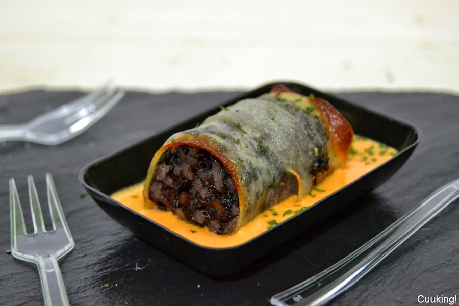 3.- Juntamos las laminas de dos en dos, ponemos la morcilla encima y enrollamos.