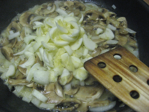 2º " Vaciamos los calabacines y lo colocamos en una sartén donde al mismo tiempo habremos puesto, aceite de oliva, los champiñones o las setas que más os gusten y la cebolla, dejamos que se poche todo el conjunto