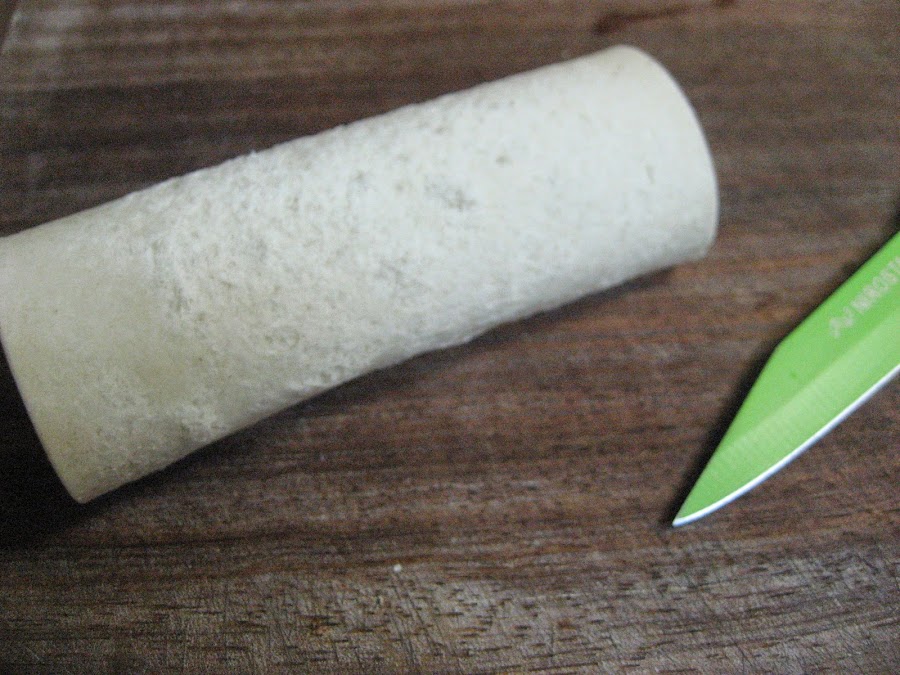 1º " Cogemos una rebanada de pan de molde y la aplanamos con el rodillo de cocina, lo cuadramos con la ayuda de un cuchillo. Lo enrollamos y le mojamos el borde con un poco de agua para que se pegue el pan consigo mismo. Antes de ponerlo en el horno le colocamos interiormente uno de esos tubos metálicos, pero en este caso envuelto con papel de cocina. Lo colocamos en el horno y vigilamos para que no se nos queme, 180º durante unos 4 ó 5 minutos, pero como depende del horno y del tipo de pan, mejor estar atento no sea que nos salgan algo morenos, je,je.