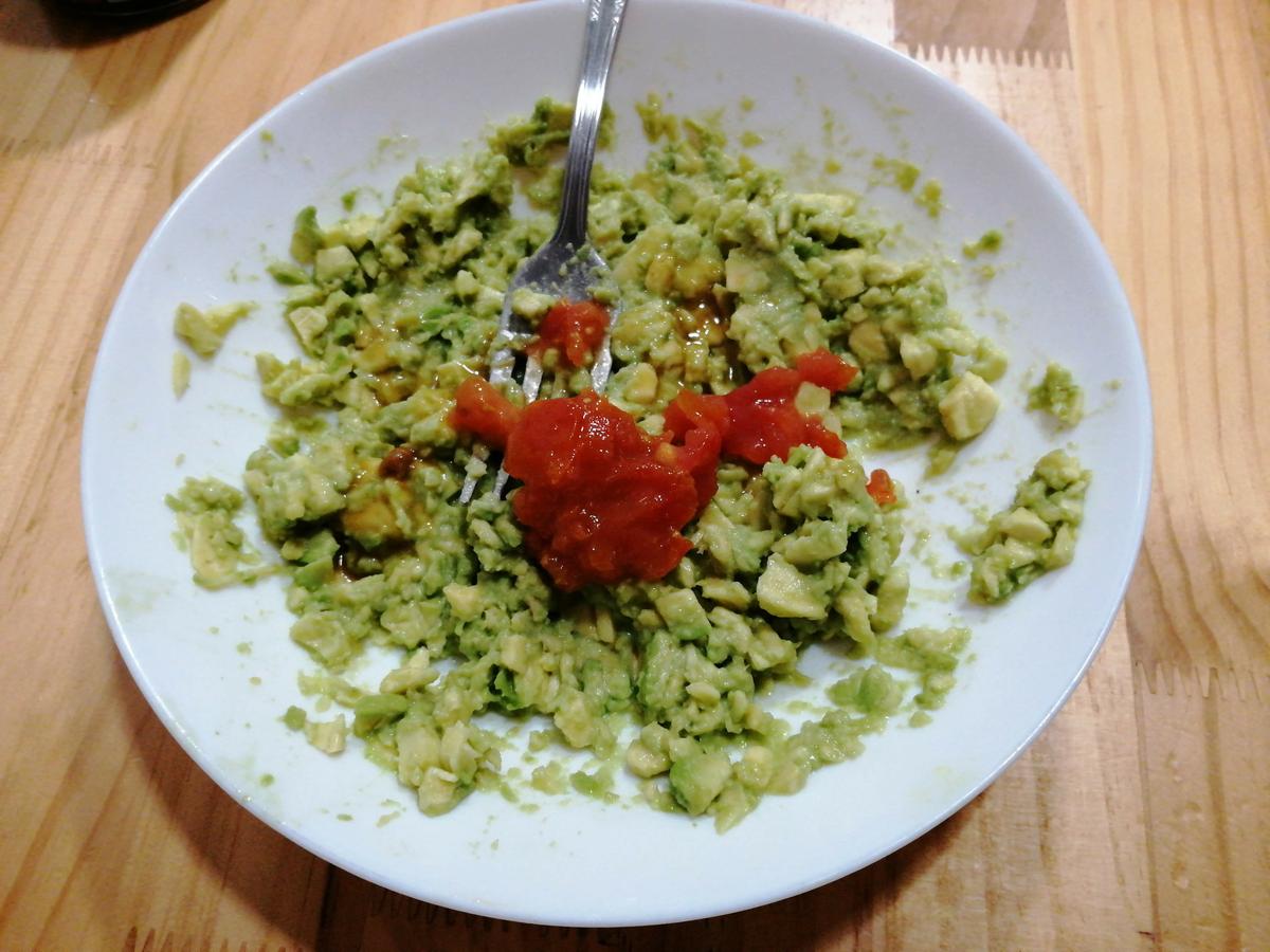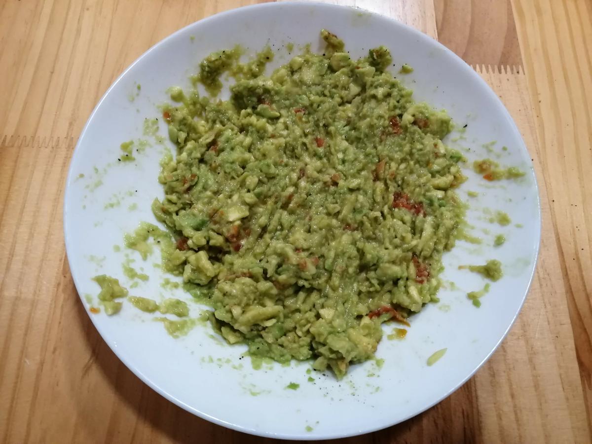 Abrimos a la mitad un aguacate y sacamos con una cuchara su contenido. En un plato lo machacamos con un tenedor. Si no está suficiente maduro quizás tengas que usar el cuchillo para trocearlo bien.
